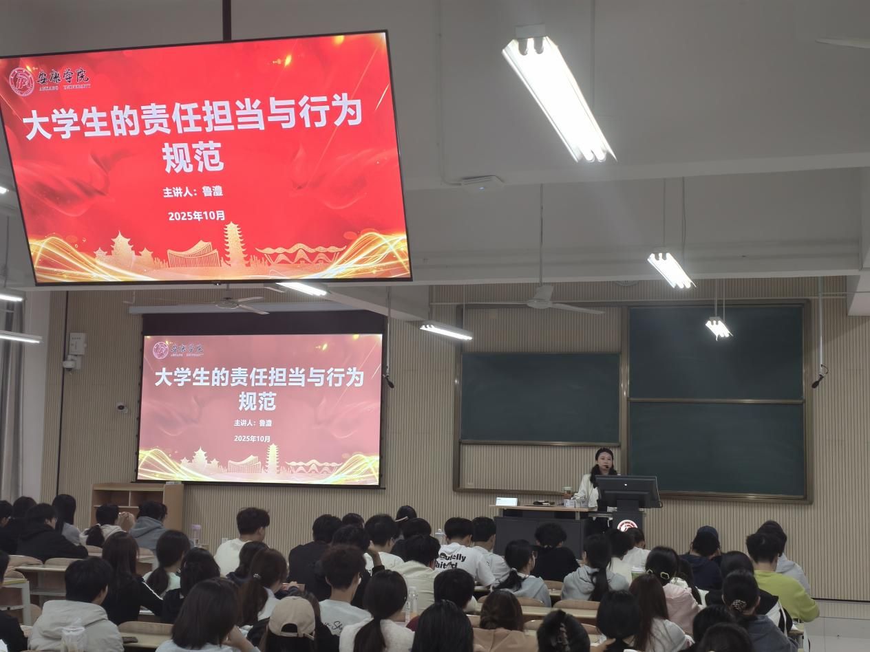 2025年10月14日晚上19点,江北校区1号教学楼1301教室座无虚席,全体新生齐聚于此,认真聆听由学院党总支副书记鲁澧主讲的入学教育第五讲——“大学生的责任担当与行为规范”专题讲座。