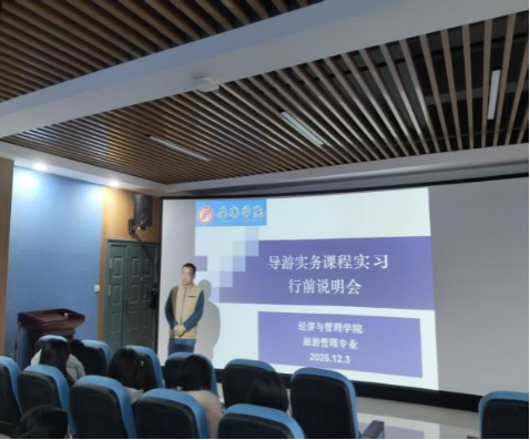 课程实习开展前,旅游管理专业教师刘智兴围绕实习行程安排、安全注意事项、实习任务要求三大核心内容展开。会上,刘老师明确各环节实践目标,拆解导游实务入店/离店服务,沿途讲解,景区讲解,景点讲解技巧及注意事项等具体任务,强调课程实习期间的纪律与安全准则,同时就学生疑惑问题,针对性解答学生关于课程实习流程、技能实操的疑问,帮助学生提前理清课程实习思路,明确实习重点,为后续导游实务课程实习高效开展筑牢筹备基础。
